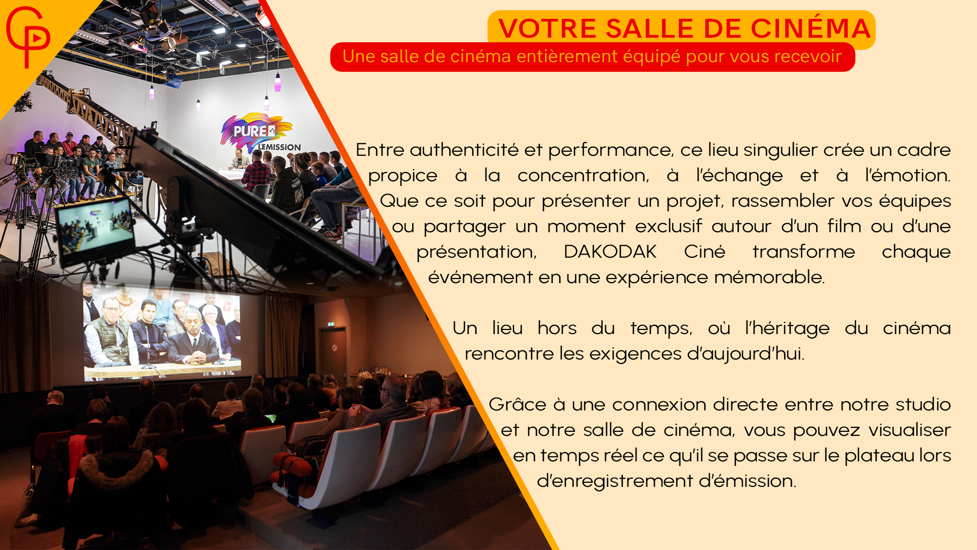 Grâce à une connexion directe entre notre studio et notre salle d e cinéma, vous pouvez visualiser en temps réel ce qu'il se passe sur le plateau lors d'enregistrement d'émission.
